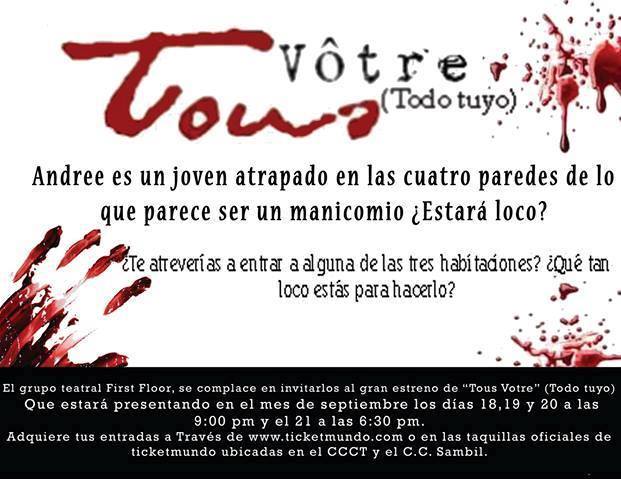 First Floor: (Andrea Castro) Todo empezó hace quince años cuando me adentré en el mundo del teatro, me enamoré de esto y me encanta crear. Sé lo difícil que es para el talento nuevo comenzar en un grupo teatral, así que este año, decidí empezar con este grupo “First Floor” junto a mi compañero Dagly Angola para poder darle la oportunidad a cualquier persona capaz y con extra de talento.