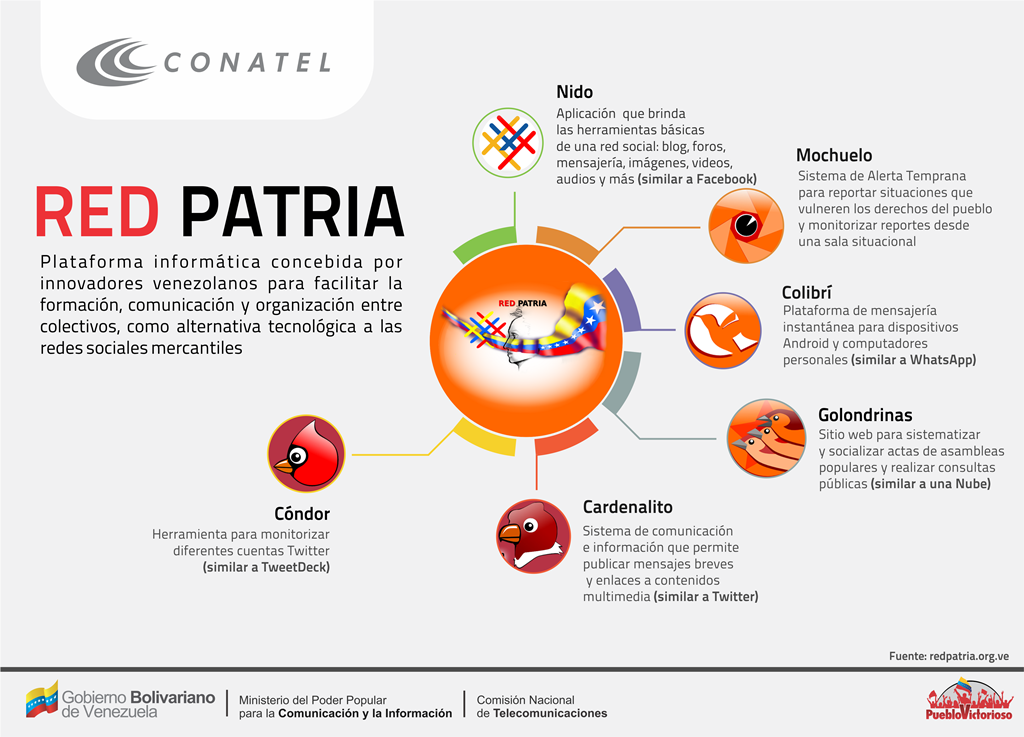 Hoy, como si nada, podemos encontrar en las redes la nueva evidencia de ese control que más temprano que tarde será implementado si no hacemos algo para evitarlo. Se trata de la llamada “Red Patria”, una plataforma tecnológica “alternativa” desarrollada por venezolanos que busca contrarrestar a las aplicaciones “mercantilistas de los Estados Unidos”. Esta Red, alojada en servidores venezolanos (sí, todos controlados por el Estado), está inspirada en especies de aves venezolanas y pretende articular esfuerzos de comunicación, en principio, entre colectivos pero con miras a consolidarse como bandera del “Poder Popular”. La “Patria” conectada en una red… ¿red para qué? Perverso fin…